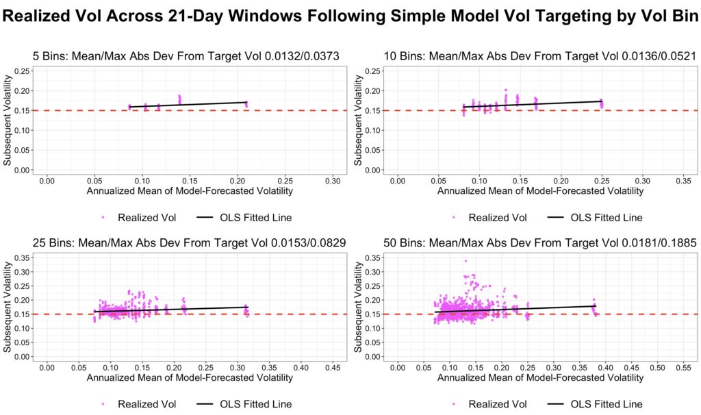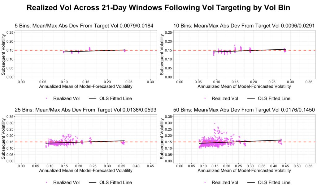 The next two figures show realized bin volatility when a constant target volatility of 15% is applied. Volatility targeting is implemented by adjusting leverage in proportion to the ratio of target volatility to forecasted volatility. We report both the mean and maximum absolute deviations of realized bin volatility from the 15% target.