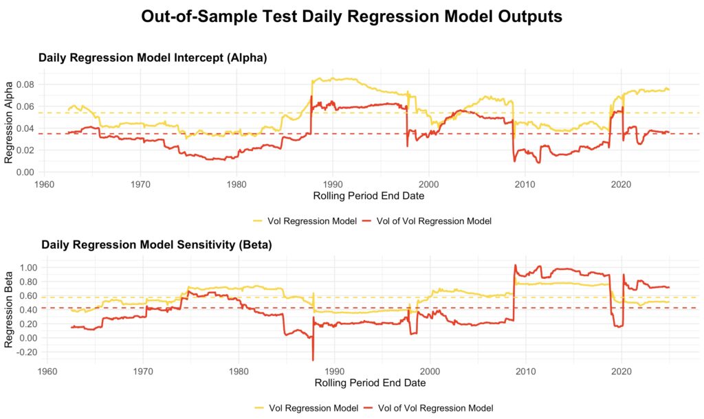 The figure below illustrates how the estimated models evolve over time. The yellow line represents the non-binned mean volatility regression model, while the red line shows the binned volatility of volatility regression model. Both models—particularly the volatility of volatility model—are highly sensitive to sudden shifts, such as the October 1987 crash entering or exiting the ten-year estimation window.