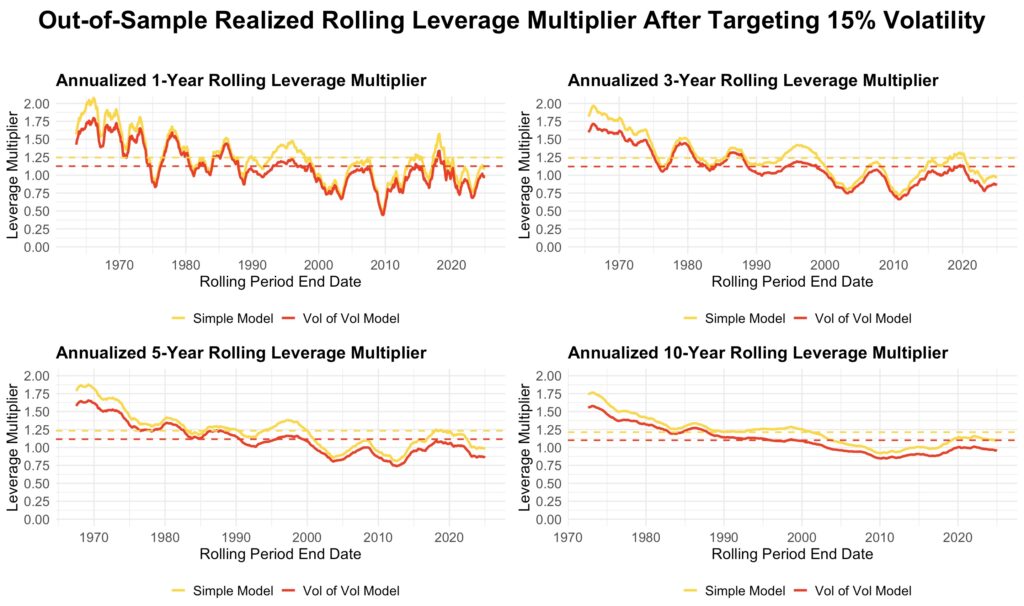 The next figure shows how the realized leverage multiplier evolves over time for rolling one-, three-, five-, and ten-year periods. The yellow line represents the multiplier from the simple model, which forecasts volatility using only the non-binned regression of mean short-term volatility. The red line represents the multiplier from the combined model, which estimates long-term variance as the sum of the squared mean short-term volatility from the simple model and the variance of short-term volatility from the binned model.
