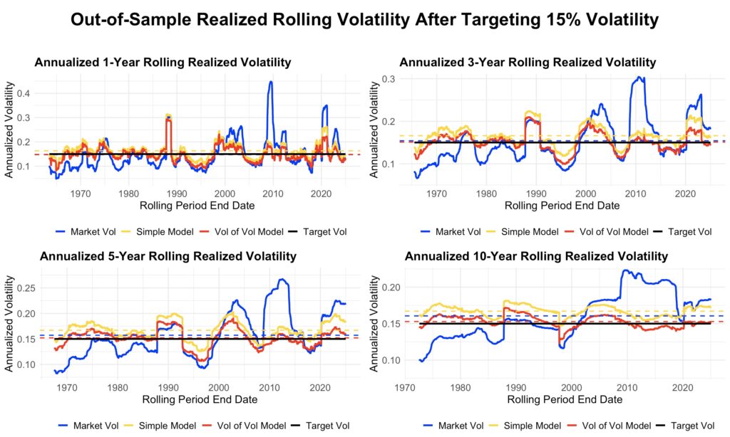 Volatility targeting smooths out major market spikes and increases leverage during periods of low volatility. Realized volatility under the combined model is consistently lower than under the simple model. The bias correction from including volatility of volatility is best observed in the rolling ten-year window: the combined model oscillates symmetrically around the target, while the simple model almost always produces volatility above the target.