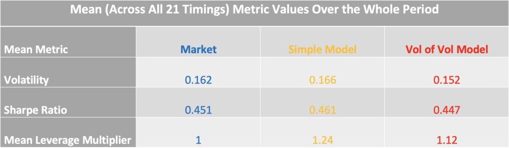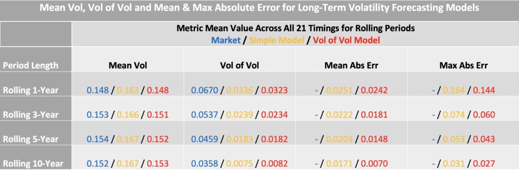 The next table summarizes statistics for different rolling periods. Across all horizons, the combined model (red) achieves more accurate volatility targeting than the simple model.