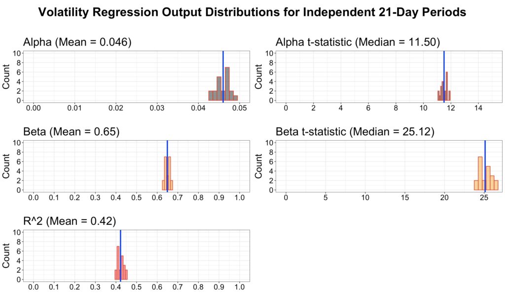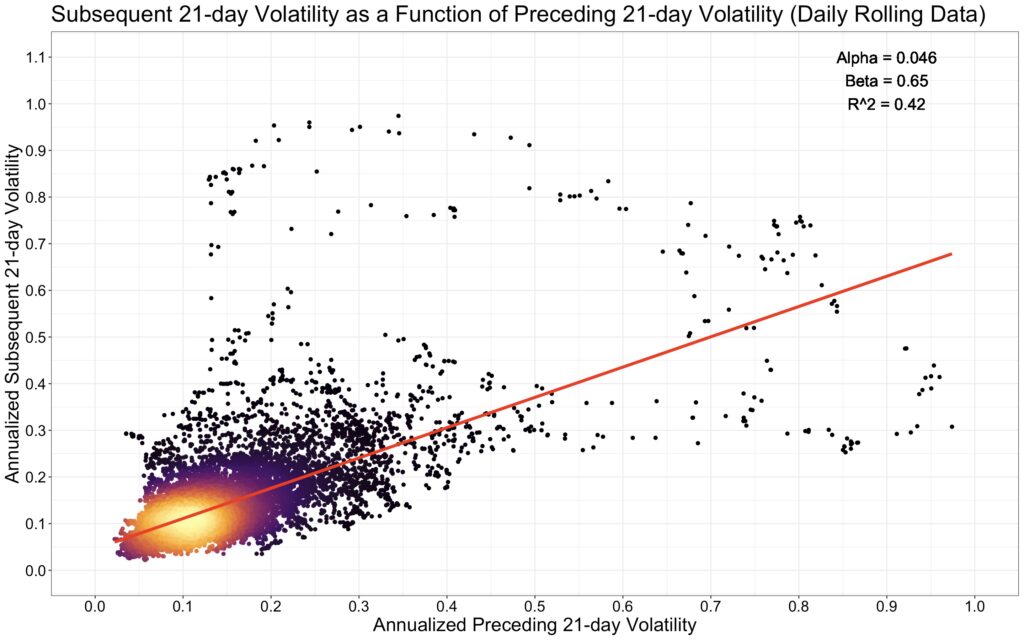 The simplest way to test this is with a linear regression. In our specification, illustrated in the figure below, subsequent 21-day volatility is the dependent variable and preceding 21-day volatility is the independent variable. We use a rolling 21-day window on daily data to maximize the amount of information.
