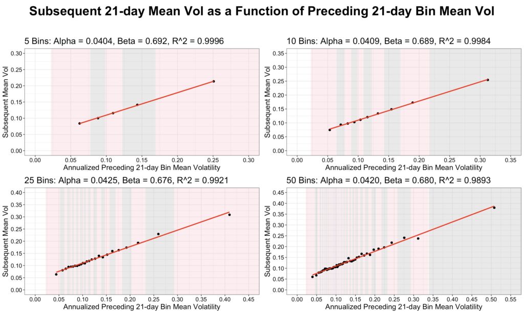 We create 5, 10, 25, and 50 bins based on 21-day volatility and show the corresponding fitted regression lines in the figure below. The relationship between mean preceding 21-day volatility and mean subsequent 21-day volatility is perfectly linear.